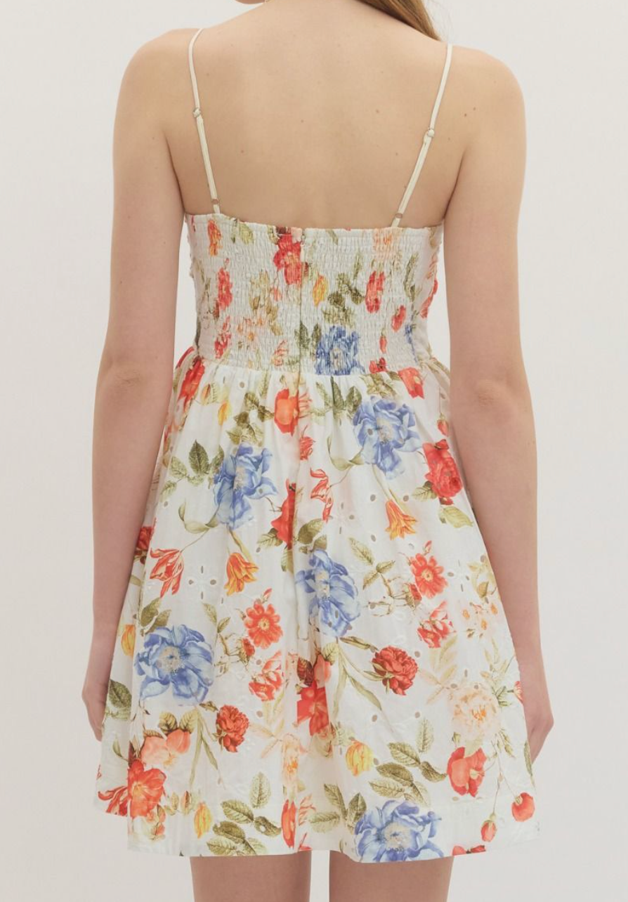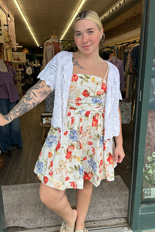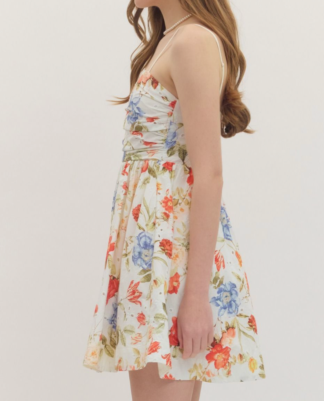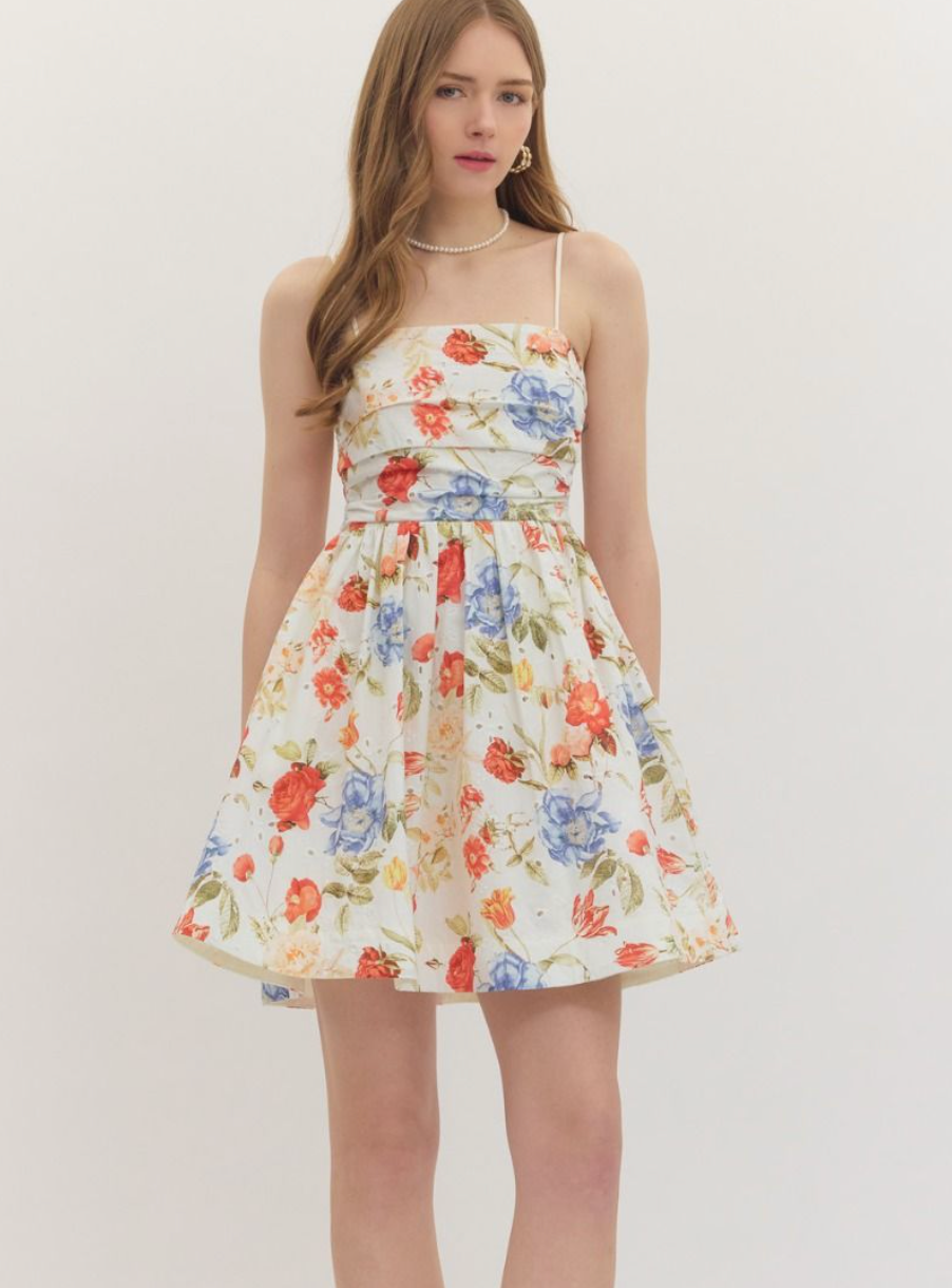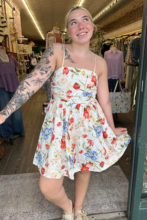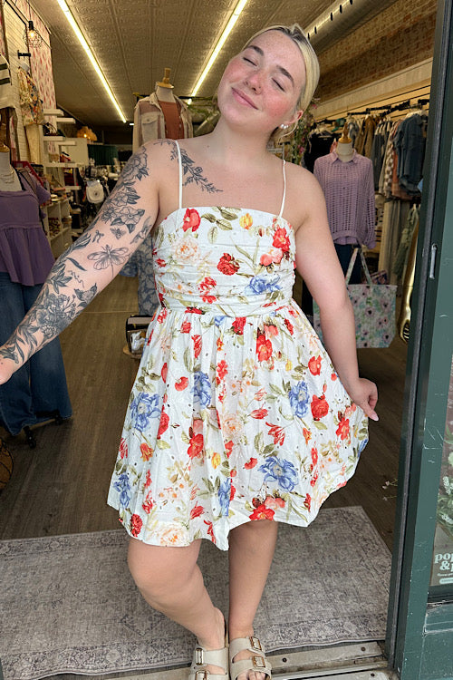 The Sorelle Floral Ruched Mini Dress is effortlessly feminine with a soft ivory base and a beautiful mix of coral and blue florals. The ruched bodice creates a flattering, structured fit while the flowy skirt adds movement and an easy, romantic feel.