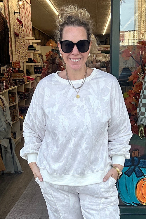 Keywords: neutral sweatshirt, tonal leaf print top, oversized pullover, fleece lounge sweatshirt, soft boutique sweater, casual cozy layers