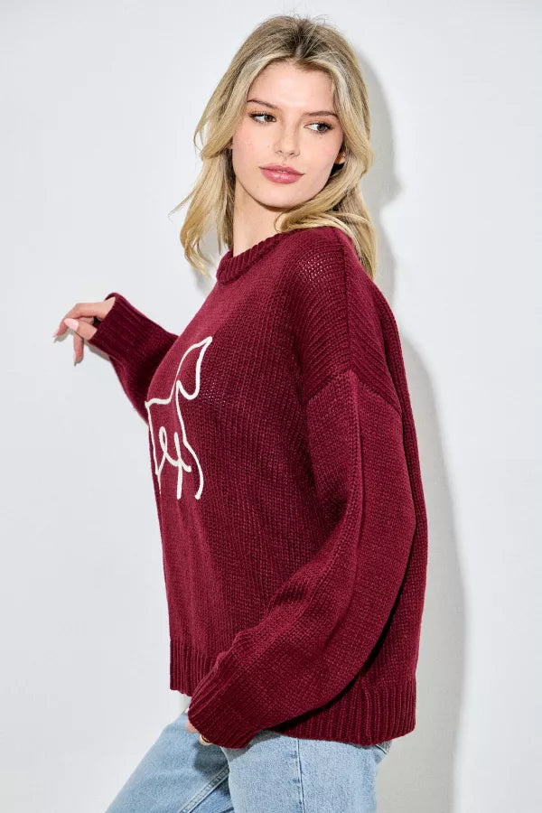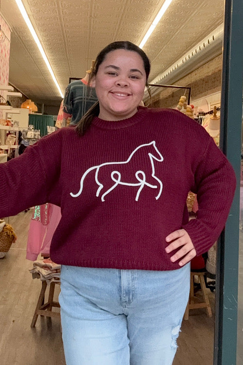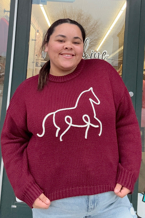 horse graphic sweater, embroidered pullover, 3D knit horse sweater, Courtland sweater, burgundy knit top, equestrian-inspired fashion, cozy acrylic sweater, statement fall knitwear