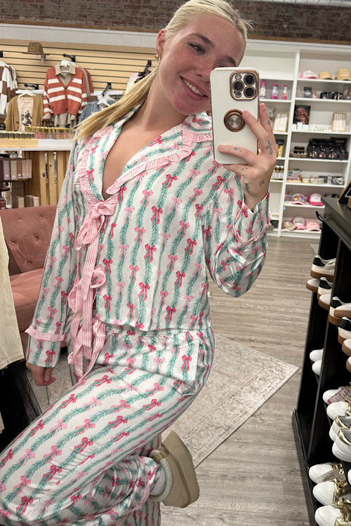 Lillian – Pink & Green Satin Christmas Bows Pajama Set