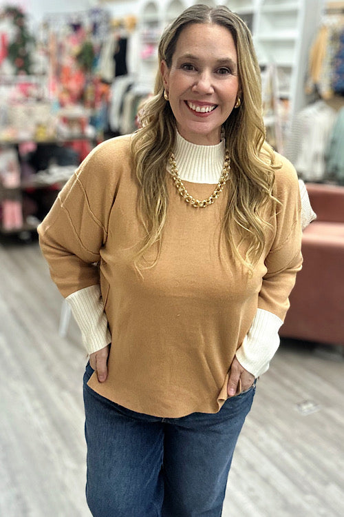 Keywords: two-tone sweater, colorblock knit, ribbed turtleneck, extended cuff sweater, lightweight pullover, cozy casual top, versatile knitwear