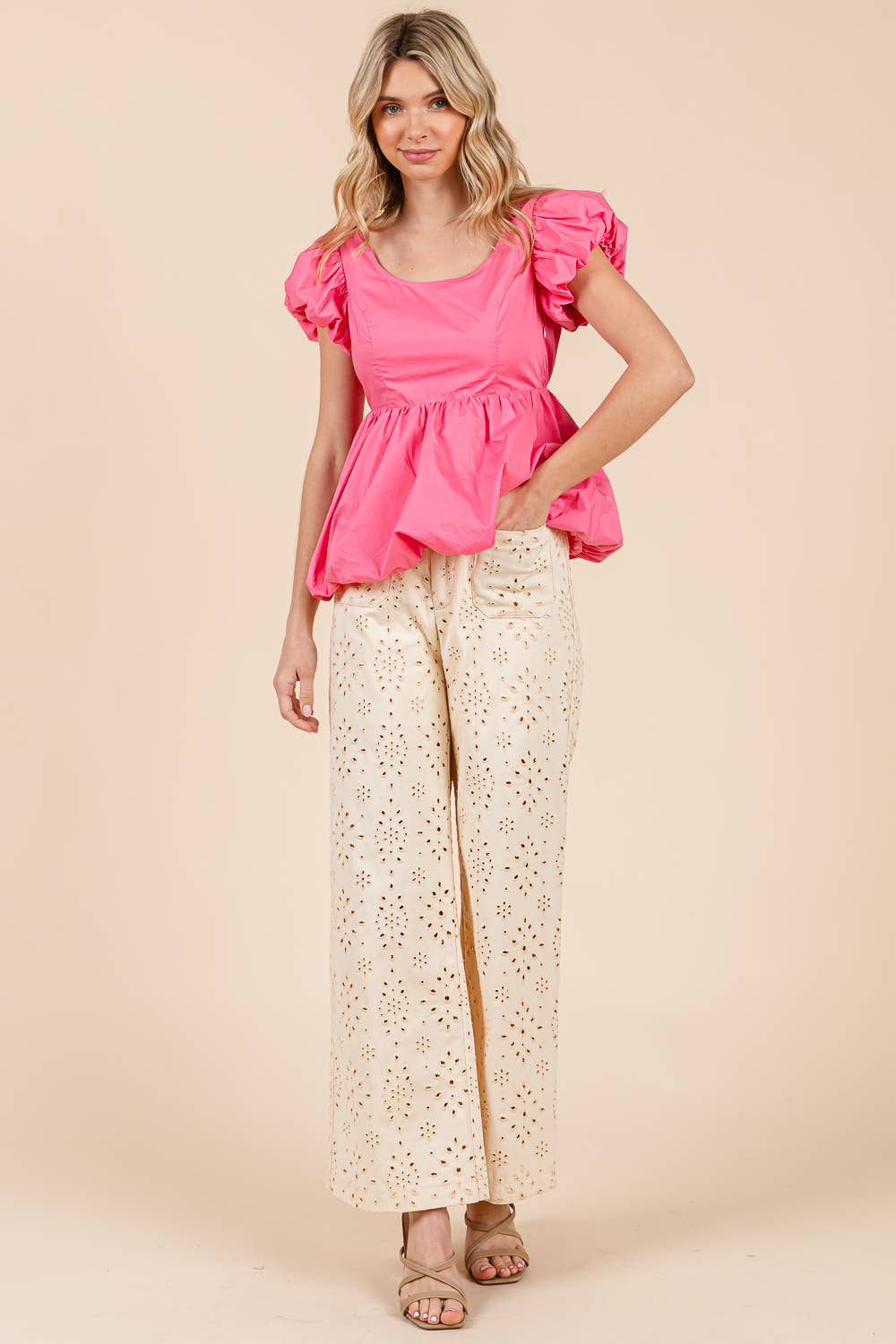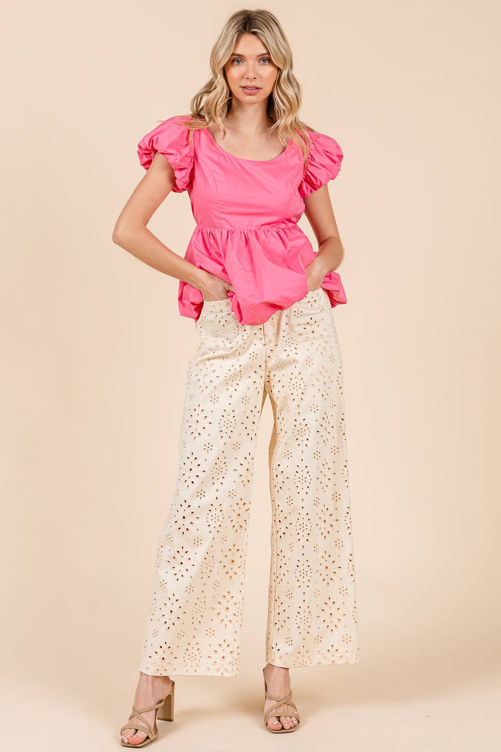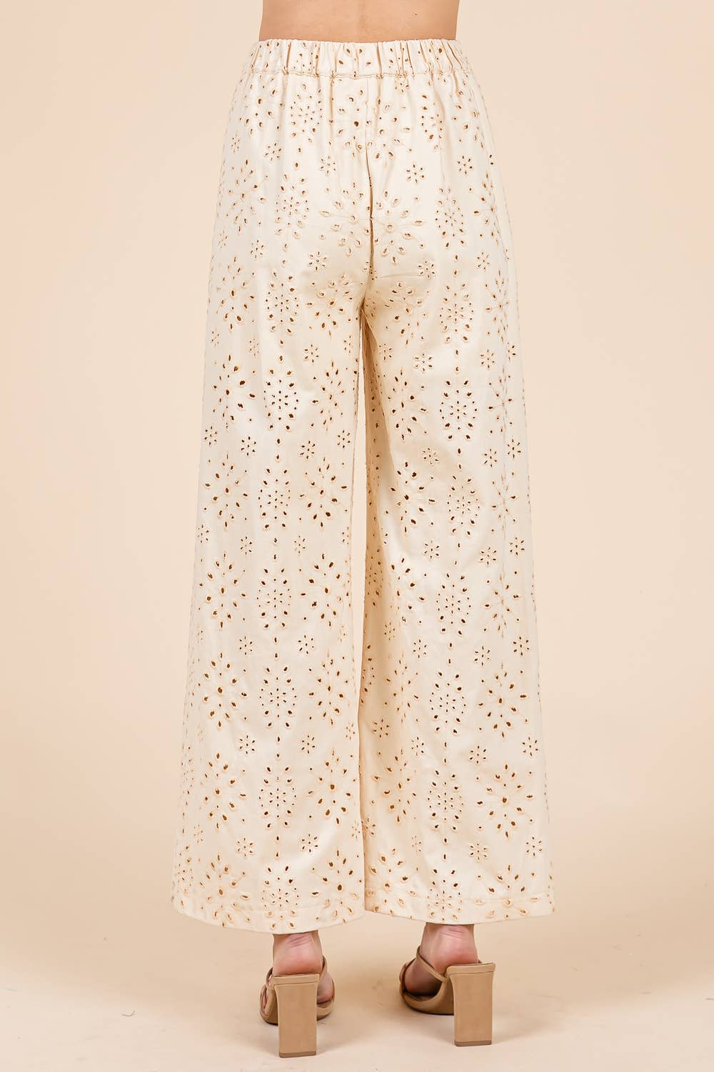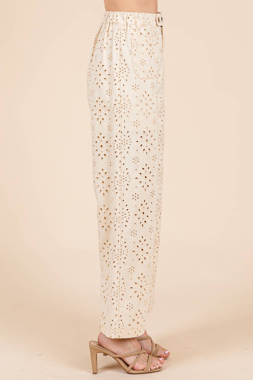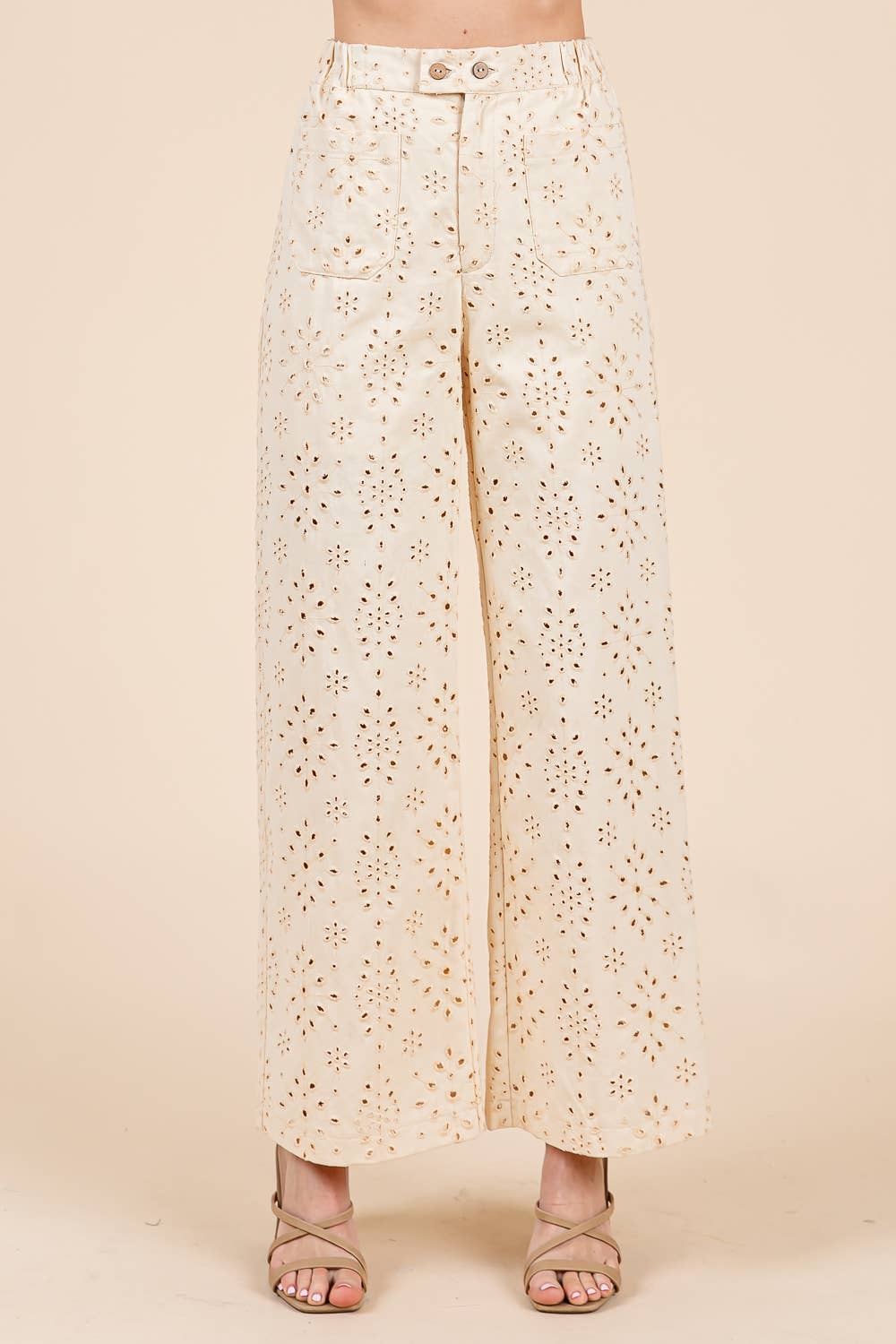 Features: regular size, standard, young contemporary, contemporary, solid color, eyelet lace, embroidered, embroidery, pants, bottom, straight leg, wide leg, full length, button closure, zipper in the front, elastic waist, front pockets, cute, stylish, fashionable, daily wear, everyday wear, Spring, Summer, S/S, women's clothing, women's apparel, women's wear