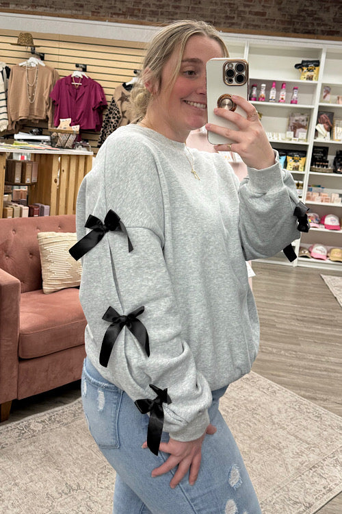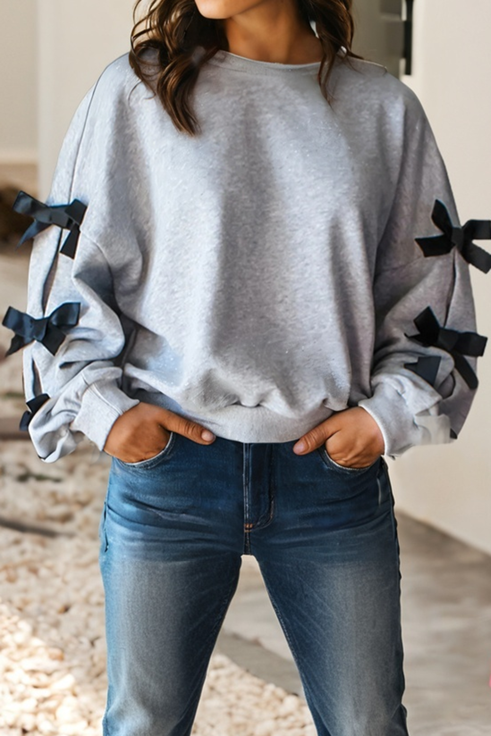 Keywords: bow knot sweatshirt, light grey pullover, solid color top, feminine sweatshirt, lightweight sweater, casual chic, comfortable pullover