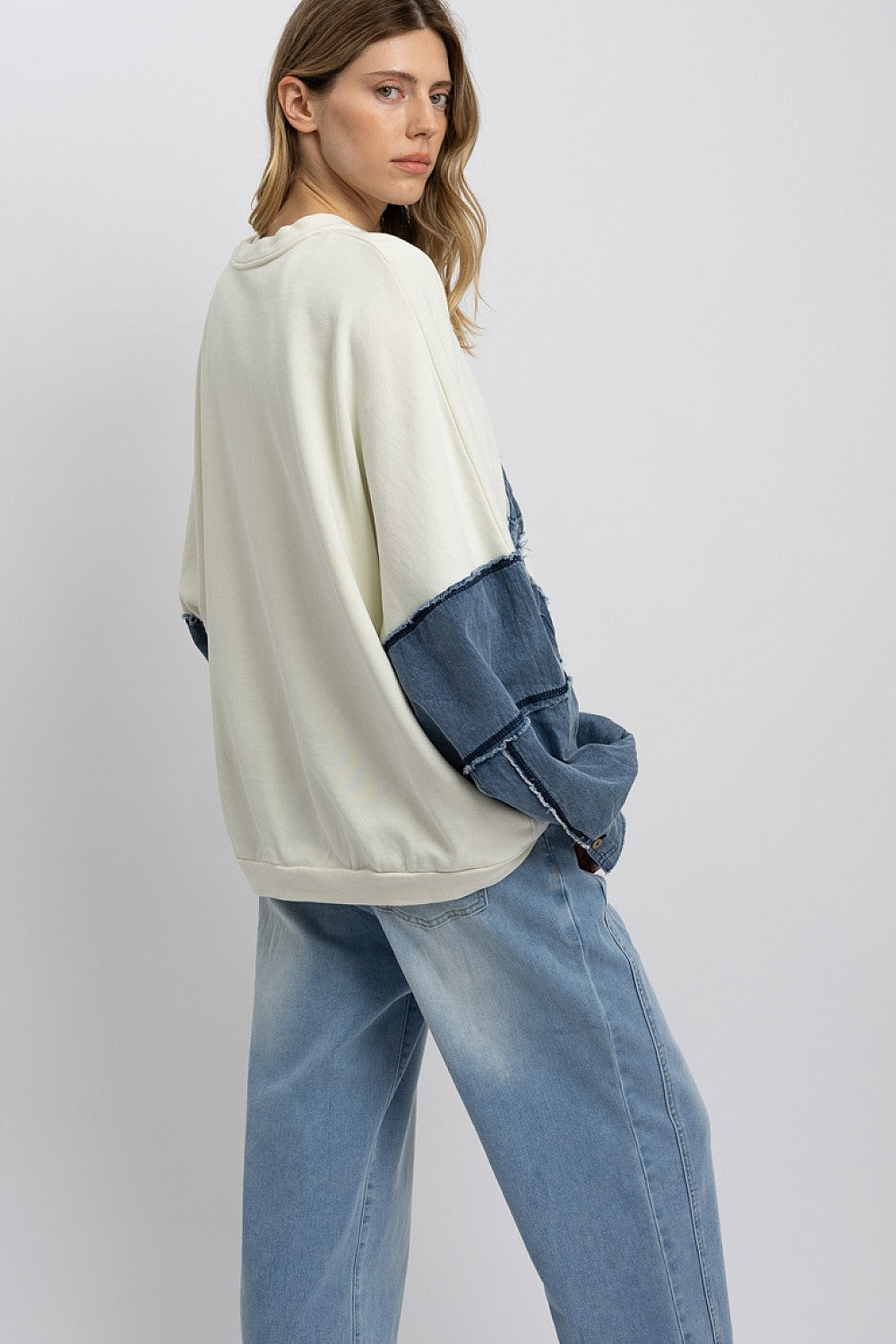 denim bow sweatshirt, oversized cotton pullover, french terry top, mineral wash sweater, contrast denim sleeve sweatshirt, boutique casual top, boho chic loungewear