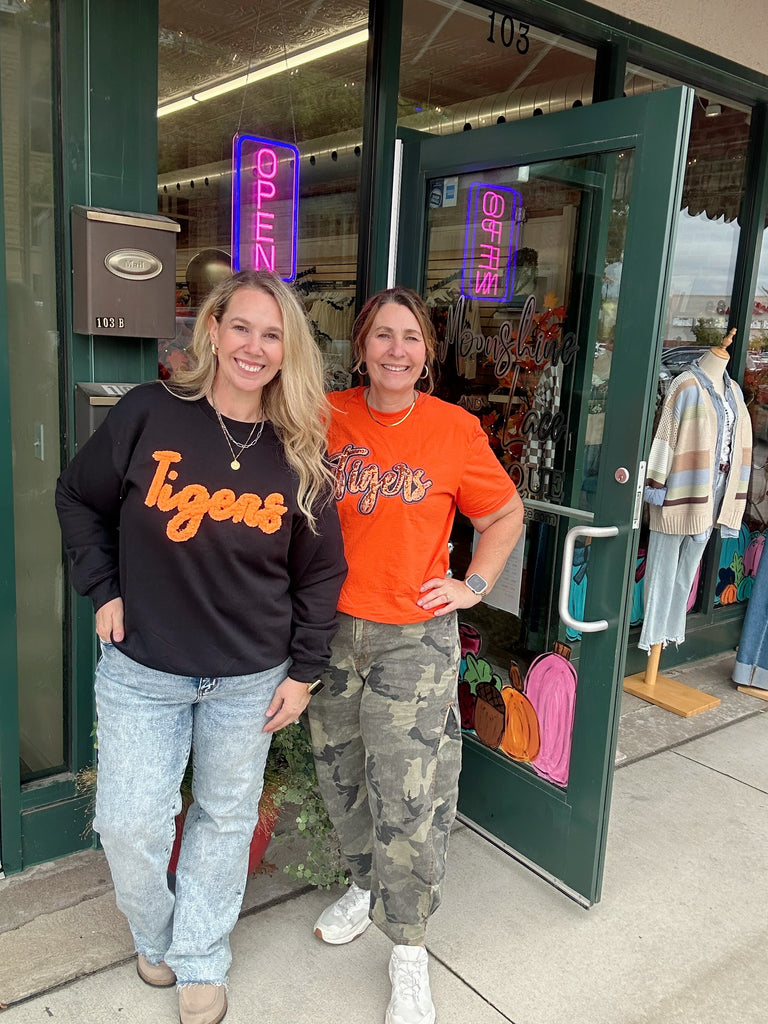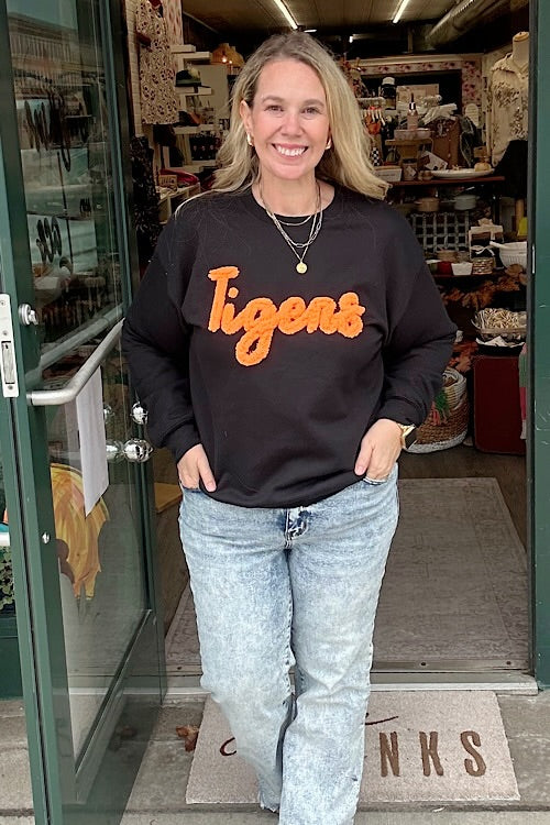 kirksville tigers sweatshirt, game day sweatshirt, chenille letter sweatshirt, black and orange pullover, cozy school spiritwear, boutique fleece crewneck, tiger team apparel