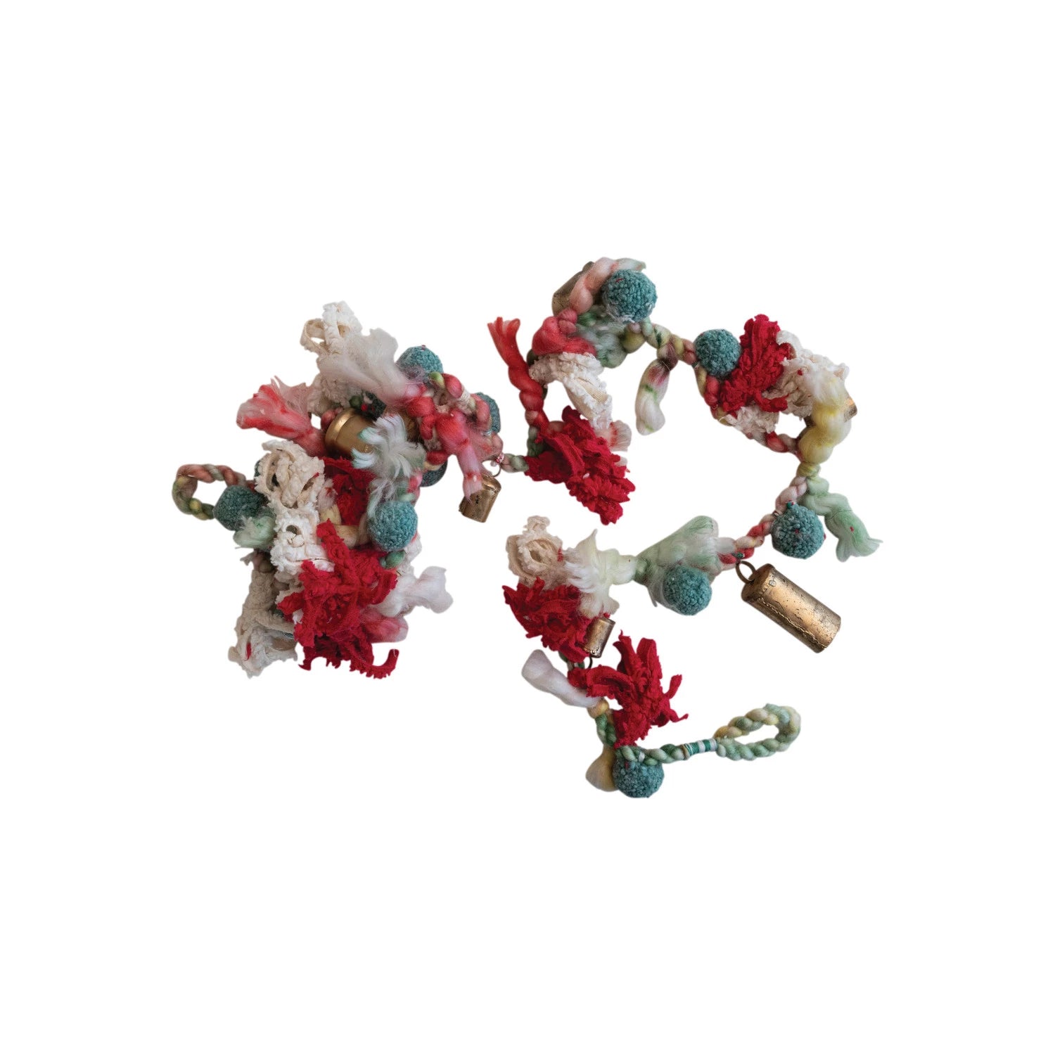 handmade holiday garland, wool and cotton pom pom garland, metal bell Christmas décor, boho holiday garland, vintage-inspired wool garland, artisan holiday decoration, handmade festive garland