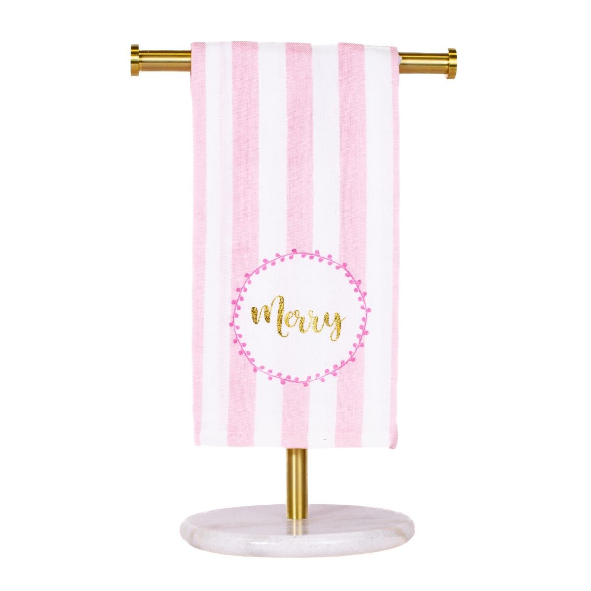 Add a touch of festive charm to your home with the Merry Script Hand Towel — a chic blend of holiday cheer and timeless style. With its pink-and-white candy stripe pattern and gold “Merry” script, this towel brings a soft, playful sophistication to any kitchen or powder room.