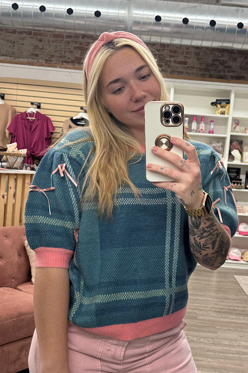 SEO Keywords: plaid knit sweater, short sleeve boutique sweater, Grace + Emma sweater, bow tie detail knit top, trendy plaid pullover, women’s casual chic sweater