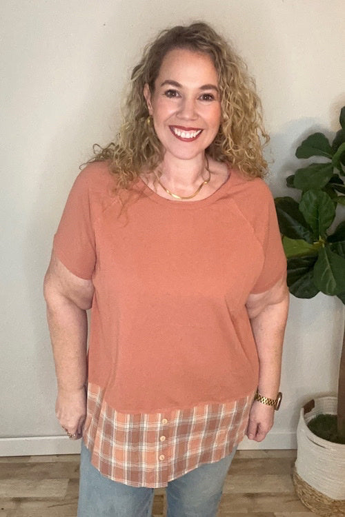 - Marsala solid top with contrast plaid shirt hem