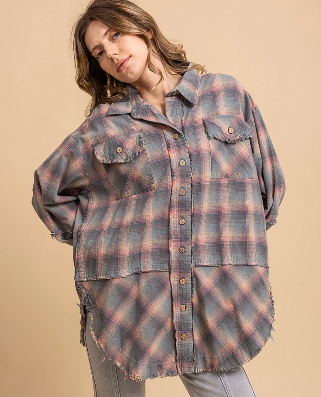 Soft, lived-in, and effortlessly cool, the Colleen Mineral Wash Plaid Button Down is your go-to layer for casual days. Featuring a muted pastel plaid with a subtle mineral-washed finish, this button down has that perfectly broken-in feel from day one. Raw edge details and a relaxed fit give it a laid-back, boutique-favorite vibe you’ll reach for season after season.