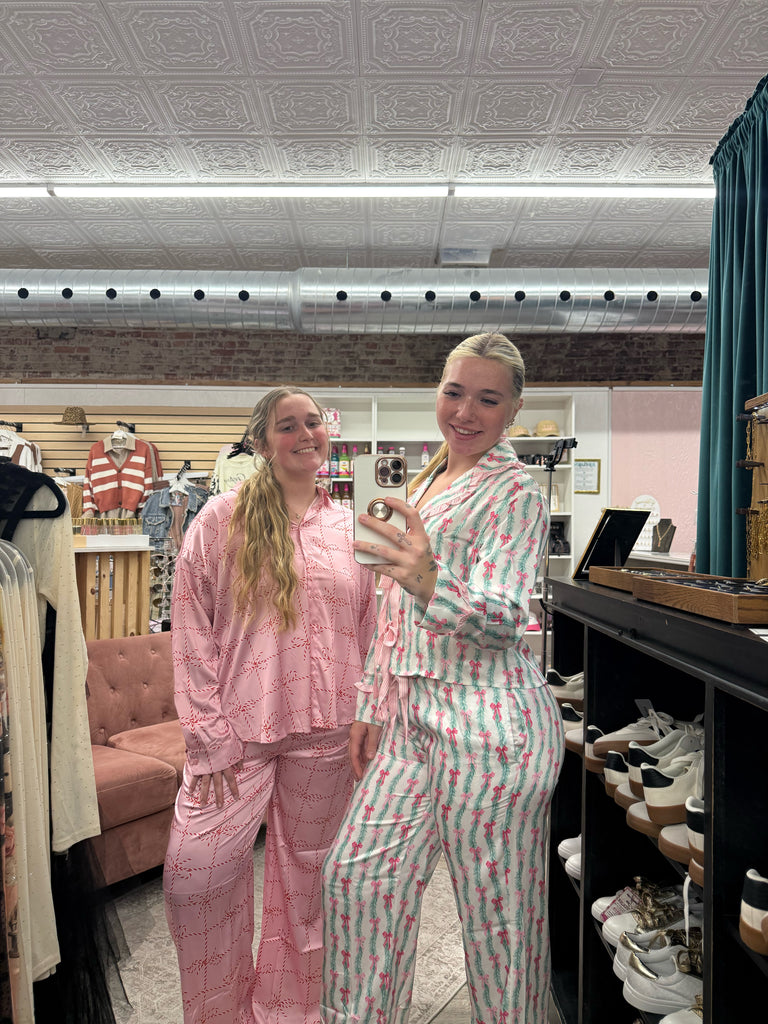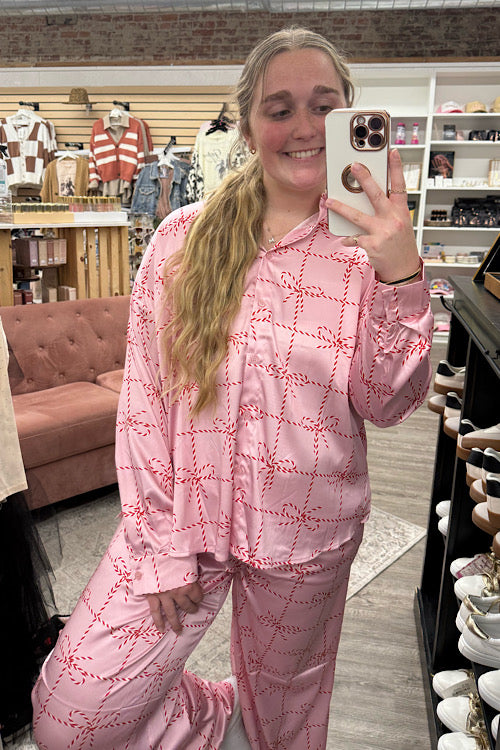 Keywords: candy cane pajama set, pink holiday pjs, women’s satin Christmas pajamas, festive satin lounge set, boutique holiday sleepwear, Christmas candy cane print pjs, silky holiday pajama set