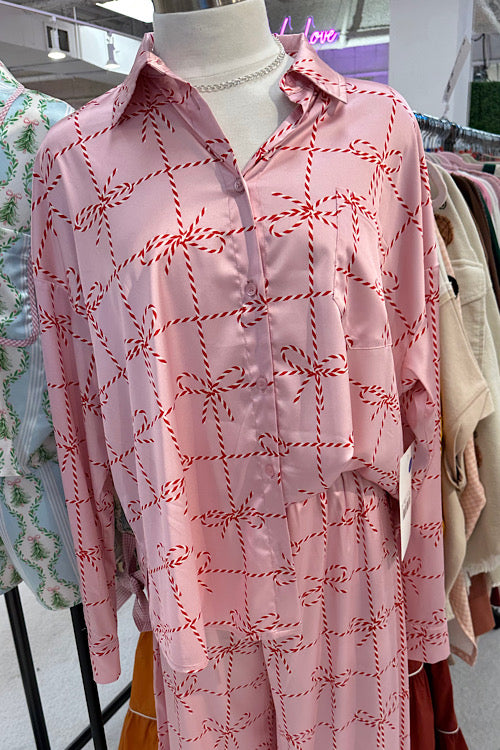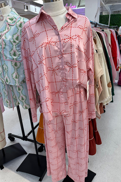 Sweeten up your holiday nights with the Holly pajama set, a silky satin duo adorned with playful red candy cane prints on a blush-pink backdrop.