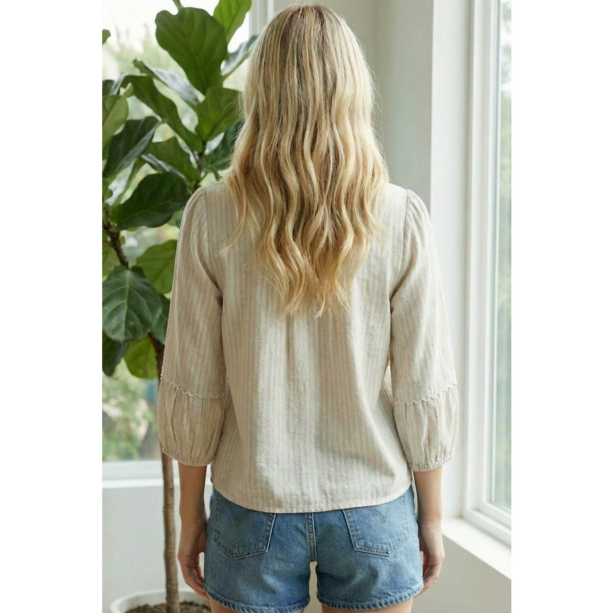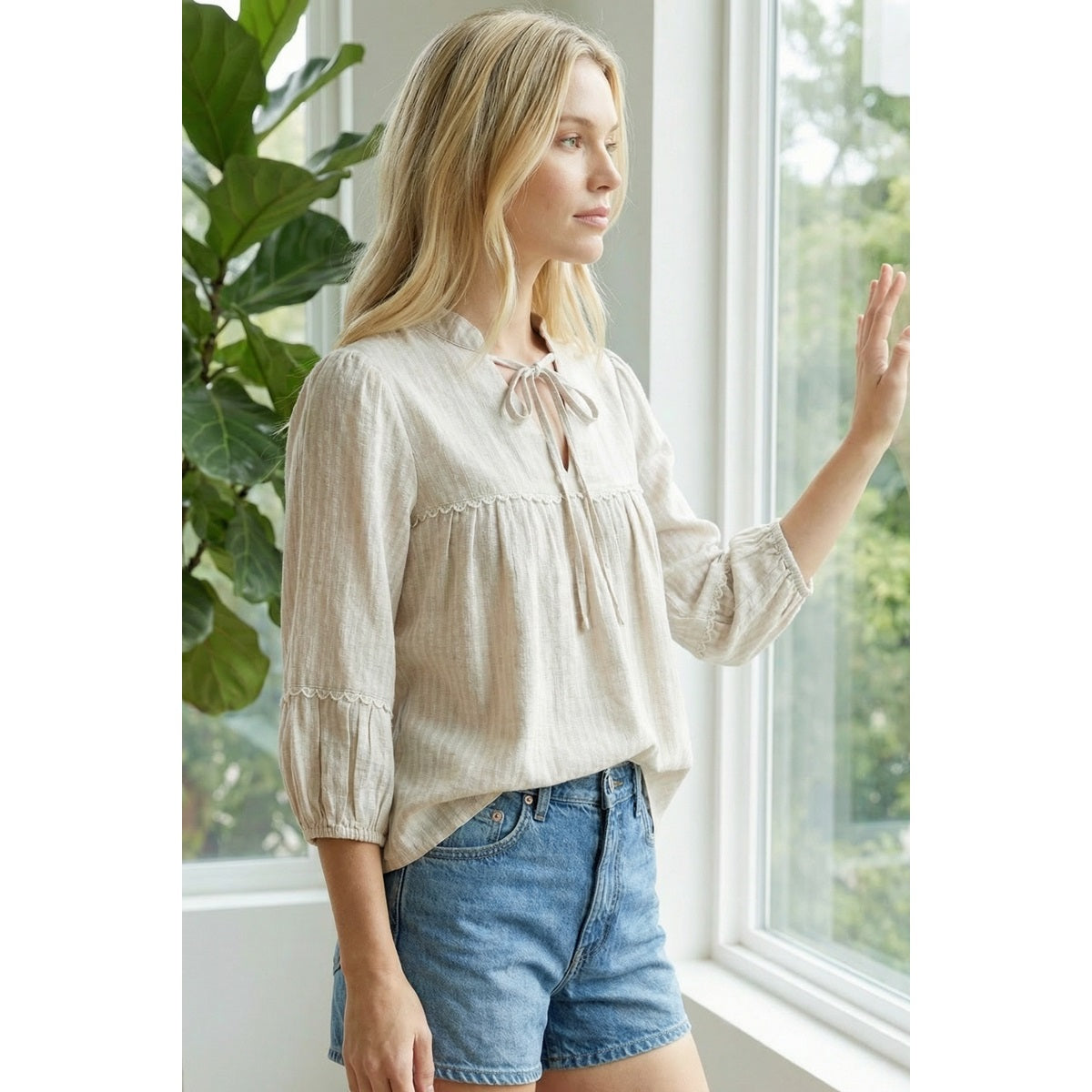 The Monica Pinstriped Tie-Neck Top is a soft, neutral staple with timeless appeal. Designed in an airy linen-feel fabric with subtle yarn-dyed pinstripes, this top features a feminine tie neckline, trim detailing, and relaxed three-quarter sleeves for an effortlessly polished look. Easy to dress up or down, it’s a go-to piece for everyday wear.