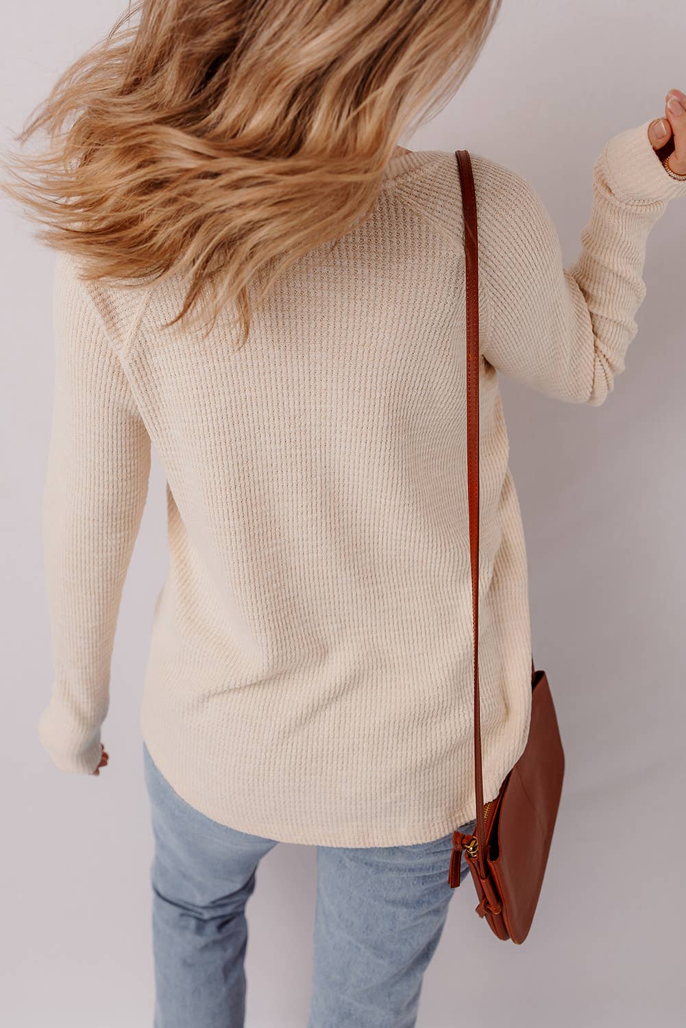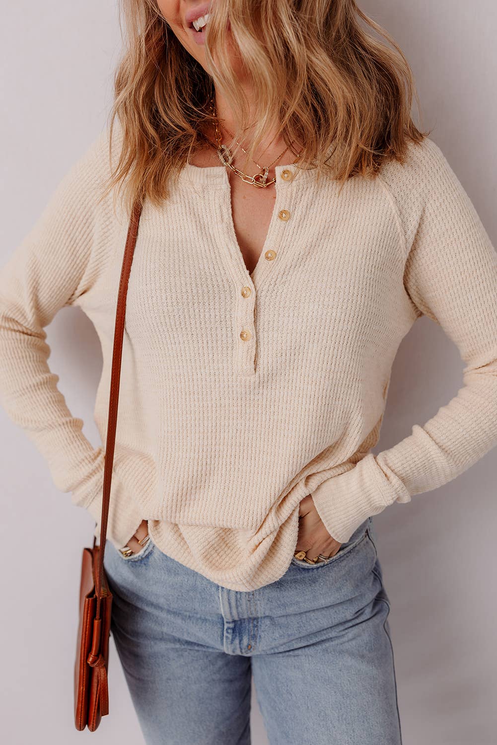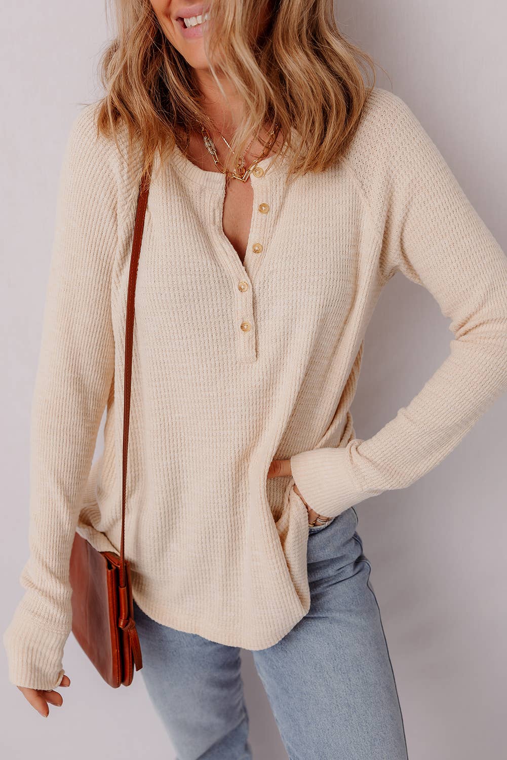 Keywords: beige knit henley top, ribbed long sleeve shirt, textured crew neck blouse, women’s fall basics, casual layering top, boutique knitwear, neutral everyday top