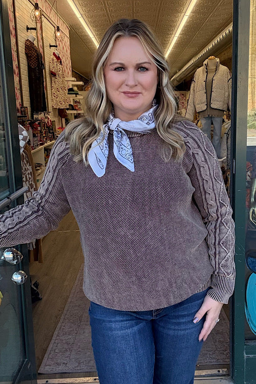 Juliet – Contrast Cable Knit Sleeve Sweater - Dark Brown