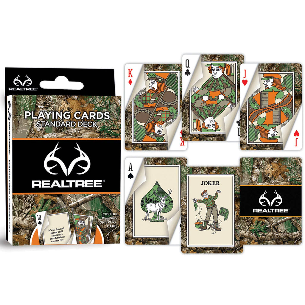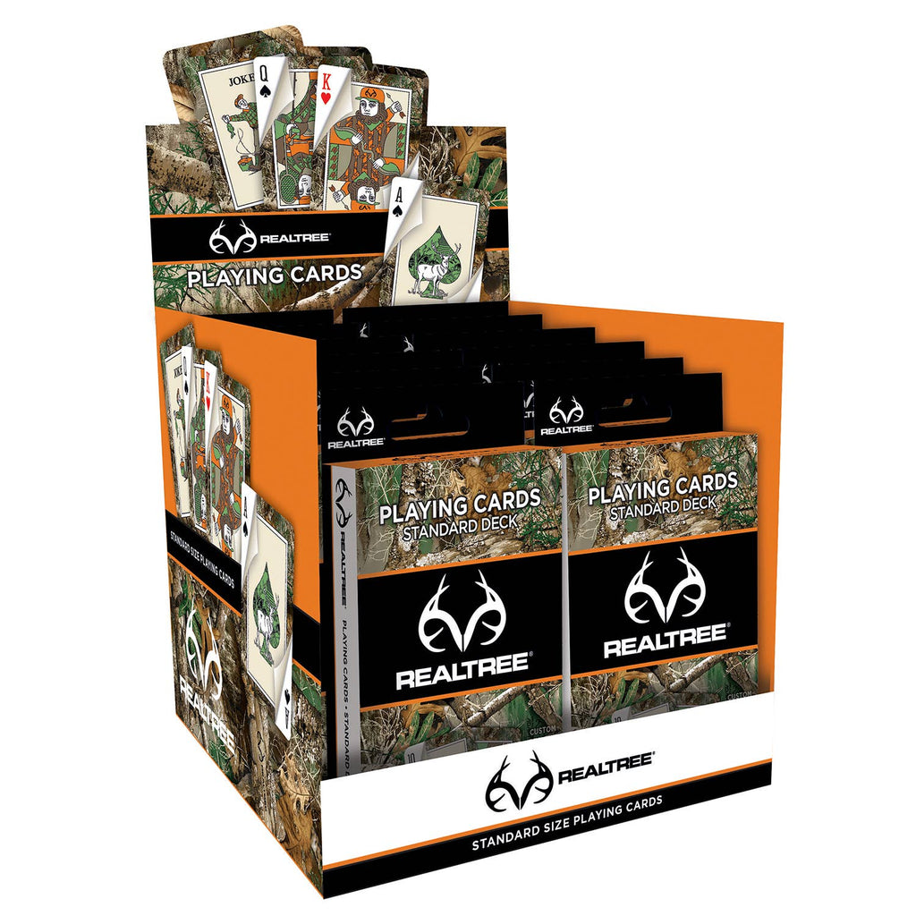 These Realtree playing cards are the perfect deck for any camo fan! Each standard deck contains 52 high quality cardstock cards and 2 jokers. Card-back designs feature the Realtree logo. All face cards and jokers have detailed, custom hunter and fisherman designs. Officially licensed and approved Realtree playing cards.